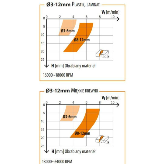 Do cięcia, kopiowania i frezowania w drewnie litym, materiałach drewnopochodnych, plastiku oraz laminatach. Przeznaczone do użytku na wysokich obrotach, na centrach obróbczych, maszynach CNC oraz ręcznych frezarkach górnowrzecionowych wyposażonych w odpowiedni uchwyt.Serie produktów