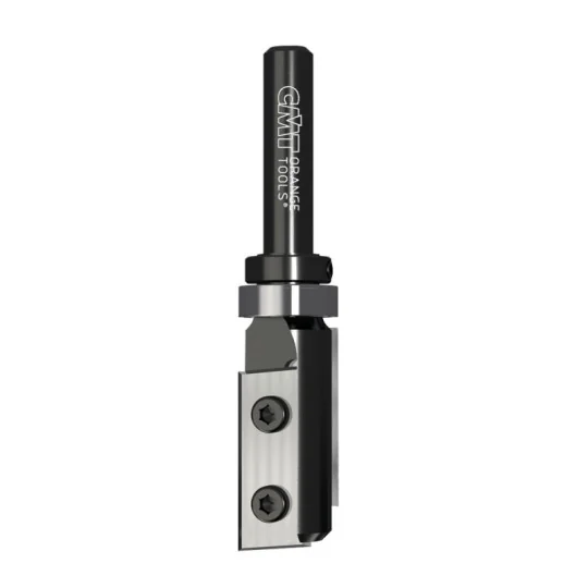 Frez prosty Z=2 na wymienne płytki mocowane za pomocą śrubek typu Torx. Wyposażony dodatkowo w górne łożysko, które umożliwia pracę z wykorzystaniem szablonu. Możliwość frezowania i wiercenia w płycie wiórowej, MDF oraz twardym drewnie. Do używania na frezarkach ręcznych jak i maszynach CNC.