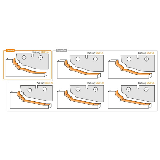 Nasze nowe głowice nadają się idealnie do produkcji mebli, szaf, drzwi i frontów kuchennych. To wyjątkowe narzędzie pozwoli Ci stworzyć 6 różnych profili poprzez użycie standardowych jak i opcjonalnych noży. Głowice z tej serii są praktycznym i ekonomicznym rozwiązaniem. Aby zachować maksymalne bezpieczeństwo pracy a także uzyskać perfekcyjne wykończenie materiału zalecamy wykonywanie prac w kilku przejściach. Przeznaczone do użytku na frezarkach dolnowrzecionowych, na wszystkich materiałach, najlepsze do drewna litego oraz materiałów drewnopochodnych.Uwagi