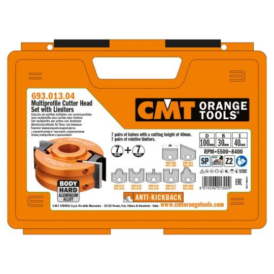 Firma CMT przygotowała 7 profili kształtowych dla profesjonalnych wykonawców. Zestaw zawiera noże do tworzenia połączeń, ramek oraz fazowania. Specjalna konstrukcja głowicy sprawia, że istnieje możliwość zastosowania w niej noży o wysokości 40 mm lub 50 mm. Konstrukcja głowicy zgodna z Europejską Normą EN 847-1. Zestaw sprzedawany w wygodniej i bezpiecznej, plastikowej walizce.Zestaw zawiera