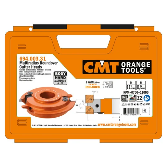 Innowacyjna głowica frezująca, mająca możliwość zamontowania trzech różnych noży, tworzących zaokrąglenie 6 różnych promieni. Standardowa głowica posiada promienie 5 i 10 mm; pozostałe dwa noże, do dokupienia, mają tworzyć promienie o rozmiarach 4-8 mm i 3-6 mm. Do zastosowania na frezarkach dolnowrzecionowych i formatyzerkach. Do wszystkich materiałów, idealna do drewna litego oraz materiałów drewnopochodnych.Uwagi