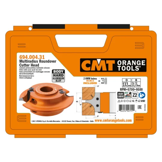 Głowica zaokrąglająca, mająca możliwość zamontowania trzech różnych noży, tworzących zaokrąglenie 6 różnych promieni. Standardowa głowica posiada noże o promieniach: 15 i 20 mm. Istnieje możliwość zakupu noży tworzących promienie o rozmiarach 12-18 mm. Do zastosowania na frezarkach dolnowrzecinowych i formatyzerkach. Do wszystkich materiałów, idealna do drewna litego oraz materiałów drewnopochodnych.Uwagi