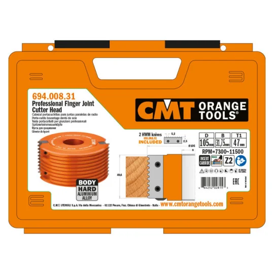 Dzięki zastosowaniu profesjonalnej głowicy CMT do łączeń, można otrzymać wytrzymałe i silne połączenia każdego obrabianego drewna oraz materiałów drewnopochodnych, o grubości do 47 mm. Przeznaczona do użytku na frezarkach dolnowrzecionowych i formatyzerkach. Dobra do wszystkich materiałów, polecana do drewna litego oraz materiałów drewnopochodnych.Uwagi