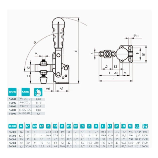 DOCISK Z DŹWIGNIĄ PIONOWĄ 150kg - PODSTAWA POZIOMA PIHER P56002