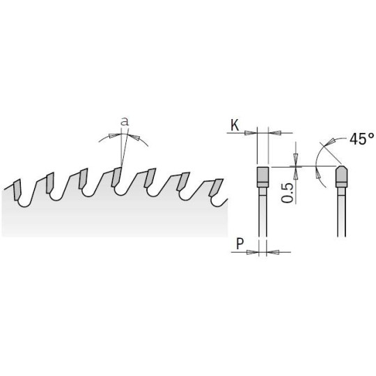 | Kod produktu | Grubość korpusu P | Grubość zęba K | Ilość zębów Z | Kąt natarcia | Kąt przyłożenia | Otwory dodatkowe | Średnica D | Średnica otworu wew. F | Zastosowanie |