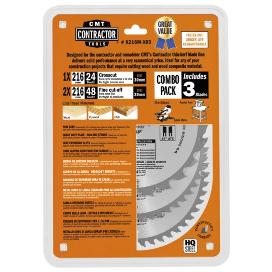 Zestaw 3 pił tarczowych do cięcia poprzecznego i wykańczającego Ø216mm, otwór mocujący 30mm. Idealne dla budowlańców i hobbystów. Najlepszy stosunek jakości do ceny. Idealne do wszelkich projektów budowlanych, które wymagają cięcia drewna i materiałów kompozytowych.