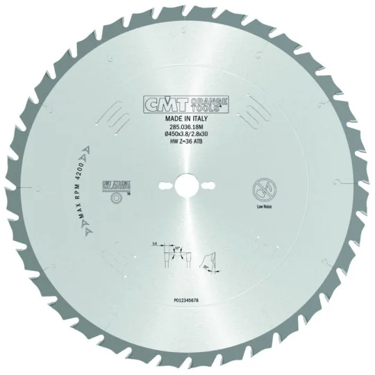 Tarcza pilarska CMT 285.036.18M posiada grubość zęba wynoszącą 3,8 mm, co zapewnia stabilność i precyzyjność cięcia. Kąt natarcia wynoszący 20° pozwala na efektywne i łatwe cięcie, a średnica 450 mm sprawia, że tarcza jest idealna do cięcia większych powierzchni. Średnica otworu wewnętrznego to 30 mm, co pozwala na łatwe zamontowanie tarczy na większości pilarek. Dodatkowe otwory 2/10/60 zwiększają kompatybilność z różnymi modelami maszyn. Tarcza posiada 36 zębów, co zapewnia szybkie i płynne cięcie, a grubość korpusu 2,8 mm gwarantuje jej wytrzymałość i trwałość. Kąt przyłożenia wynoszący 10° NS (ATB) dodatkowo poprawia jakość cięcia i zmniejsza ryzyko uszkodzenia materiału.