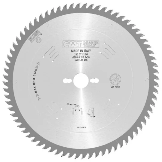 | 294.072.22M | 1-2 dni | 2,2 mm | 3,2 mm | 72 | -5° Neg. | 15° NS (ATB) | COMBI3 | 305 mm | 30 mm | Drewno |