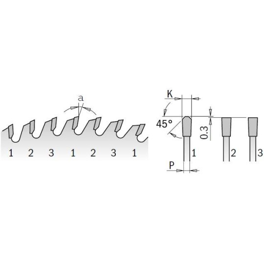 | Kod produktu | Grubość korpusu P | Grubość zęba K | Ilość zębów Z | Kąt natarcia | Kąt przyłożenia | Otwory dodatkowe | Średnica D | Średnica otworu wew. F | Zastosowanie |