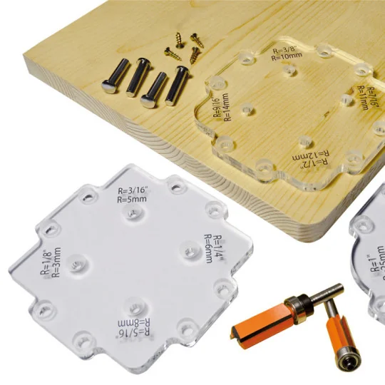 Nasz przydatny 3-częściowy zestaw szablonów do tworzenia zaokrągleń składa się z 3 akrylowych szablonów o grubości 8 mm, dzięki którym stworzysz w łatwy sposób aż 12 różnych promieni (4 na każdym szablonie) stosując frezy proste z górnym, lub dolnym łożyskiem (brak w zestawie). W zestawie znajdziesz 4 kołki mocujące, za pomocą których dopasujesz szablon do obrabianego materiału i 4 śruby do drewna, dzięki którym przytwierdzisz szablon. Po usunięciu kołków możesz przystępować do pracy, używając naszych frezów i zestawu do zaokrągleń uzyskasz pożądany promień na obrabianym materiale.